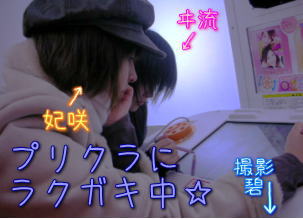 | やっぱり、私達も女子大生ですから☆ プリクラは、撮りまくります☆ 碧は、真剣にらくがきしてる二人をこっそり… パシャリ☆ →この写真は、ヰ流ちゃんも、妃咲ちゃんも 撮られた事に気付いてなかったり♪ |